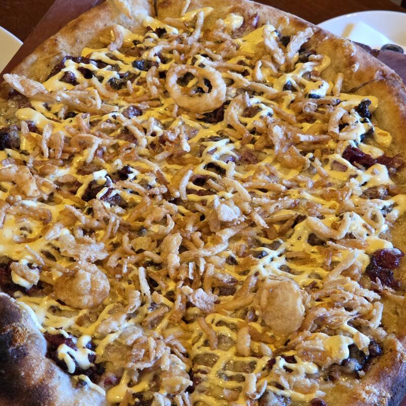 Hot Pastrami Pizza 12/30-2/2 EVOO base, sliced pastrami, Swiss cheese, finished with a horseradish mustard sauce and French's crispy onions.