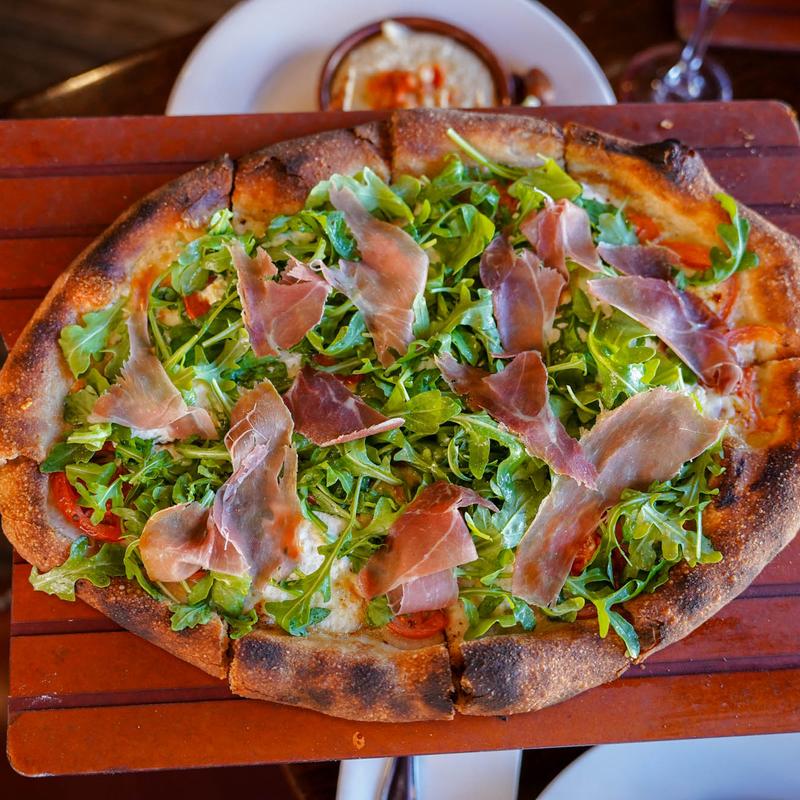 EVOO, cream, plum tomatoes, fontina and ricotta cheeses, baby arugula, dressed with lemon vinaigrette and topped with prosciutto di Parma